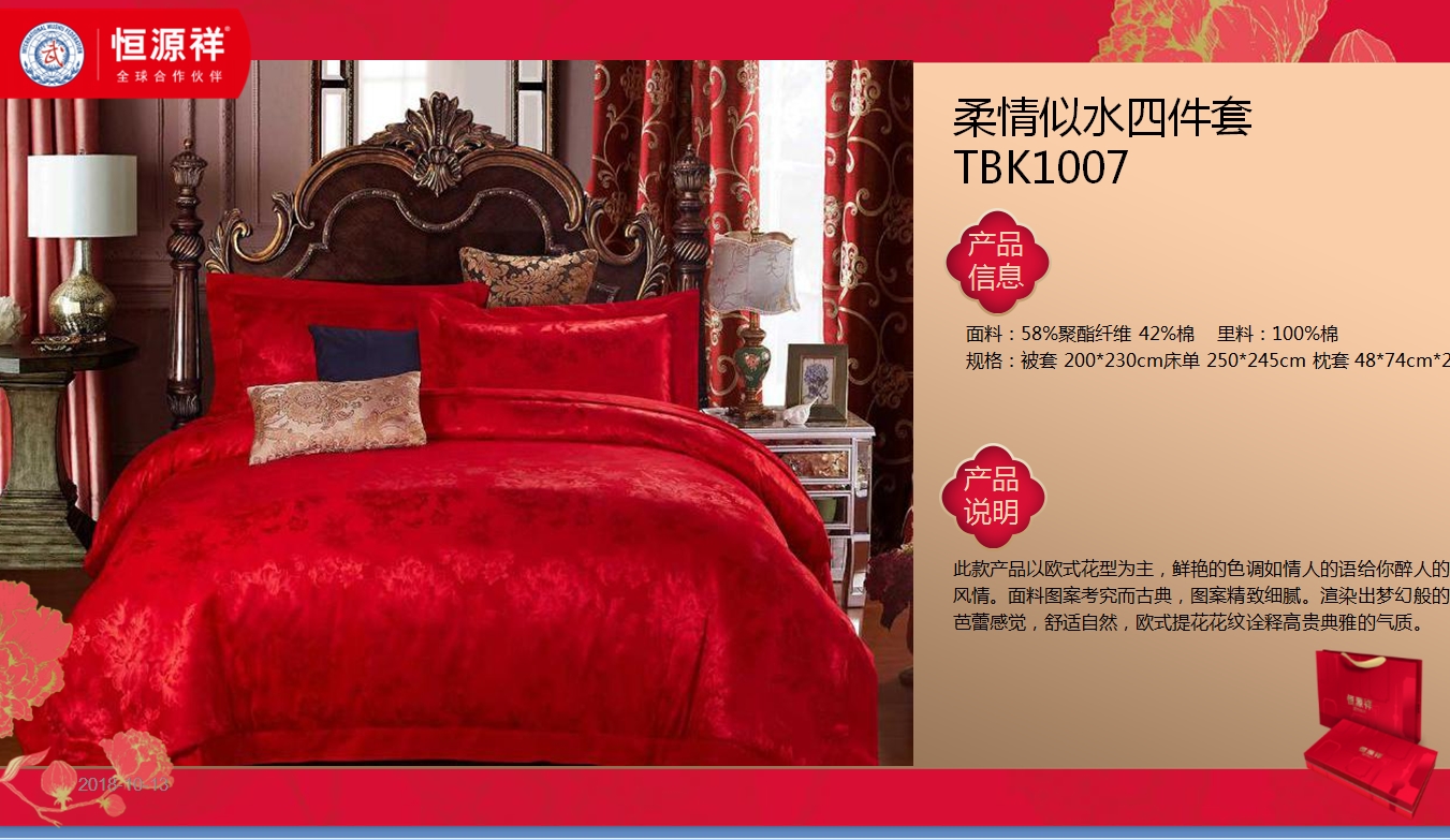 此款產(chǎn)品以歐式花型為主,鮮艷的色調(diào)如情人的語(yǔ)給你醉人的風(fēng)情。面料圖案考究而古典,圖案精致細(xì)膩。渲染出夢(mèng)幻般的芭蕾感覺,舒適自然,歐式提花花紋詮釋高貴典雅的氣質(zhì)。